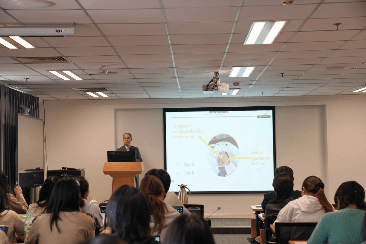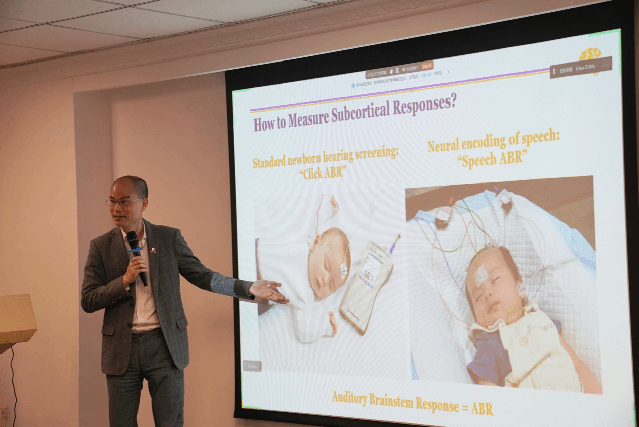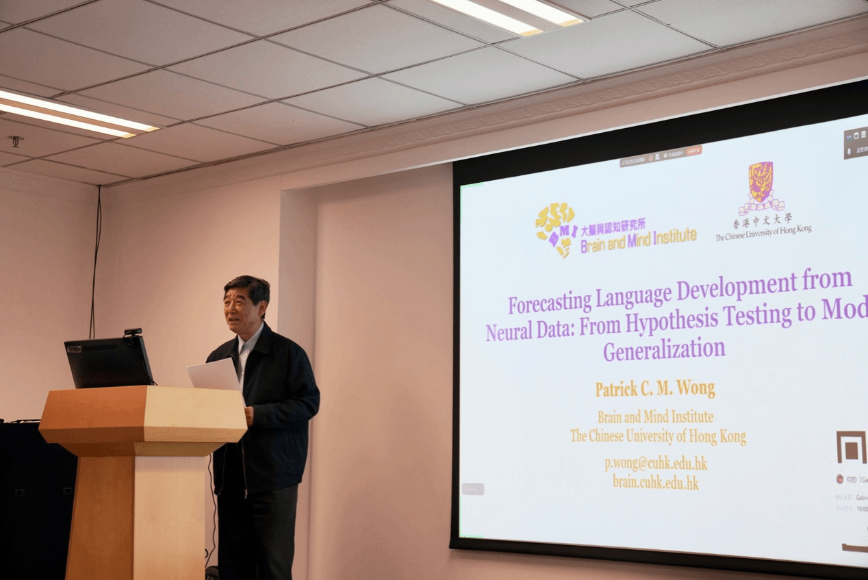 黄俊文教授的讲座题为“用神经数据预测语言发展:从假设检验到模型泛化”,主要聚焦于团队前期的系列研究成果。黄教授探讨了大脑皮层及皮层下区域的发育情况与婴儿时期母语和非母语语音处理之间的关系,旨在揭示大脑的神经信号对语言发展的预测作用。此外,黄教授还介绍了早产儿以及人工耳蜗植入儿童在语言发展方面的不同表现,重点说明了如何利用神经生物数据对他们未来的语言发展进行预测,从而实现更早期、更精准的干预和治疗。这些科研成果有望在未来帮助家长和医疗专家更科学地预测儿童的语言发展轨迹,并及时采取有效措施促进他们语言能力的发展。