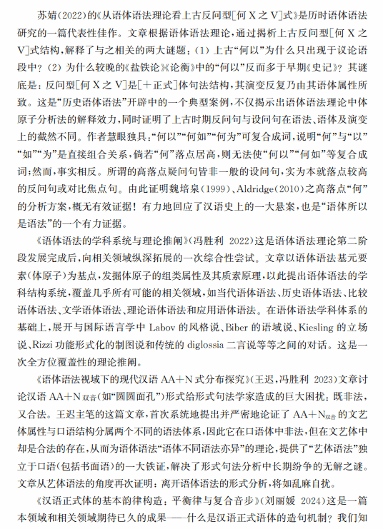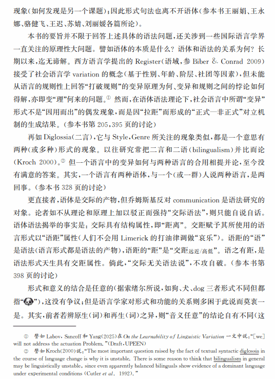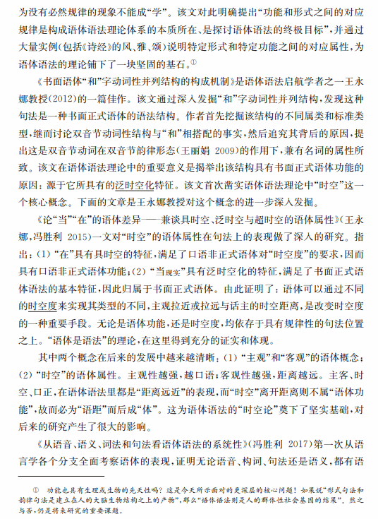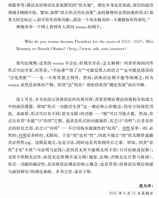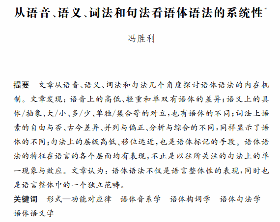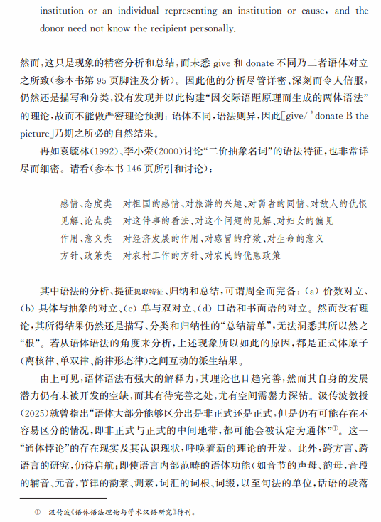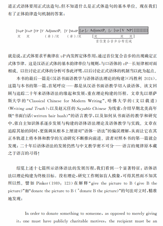 语体语法是汉语语言学在自主知识体系下构建的一个新型理论,得到语言学界普遍认可和好评(参陆俭明、汲传波等学者的评述)。然而,语体语法在今天的蓬勃发展中,面对如下两个方面的迫切需求:(一)研究者亟待了解10余年来该理论构建中,每一次发展的核心思想和每一步推进的核心机制,因此梳理、整合势在必行;(二)十年来受到该理论影响而力图推动的年轻(包括资深)学者在认识、应用和发展中,每每出现一些概念的误解和理论的偏误,亟需釐清和纠偏。有鉴于此,冯胜利团队的前沿学者经过匿名遴选,精选出21篇有关理论构建和机制发掘方面的论文,以飧读者。该论文集同时也标记着语体语法理论的每一步推新及其发展过程和将来的前景和方向。