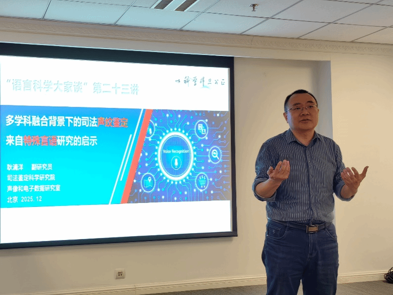 2025年12月19日下午,北京语言大学语言科学与资源学院在综合楼1211会议室成功举办第二十三场“语言科学大家谈”系列学术讲座。本次讲座特邀司法鉴定科学研究院耿浦洋副研究员担任主讲,由院长曹文研究员主持,吸引了学院内外众多师生到场听讲与交流。
