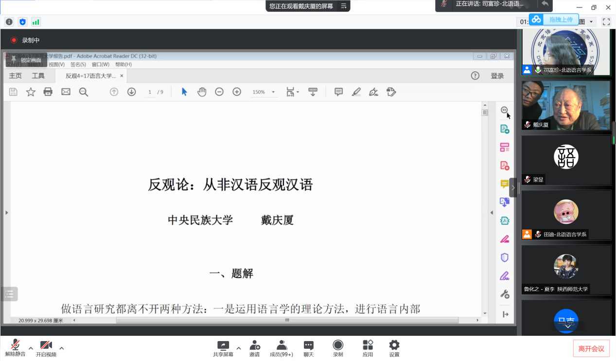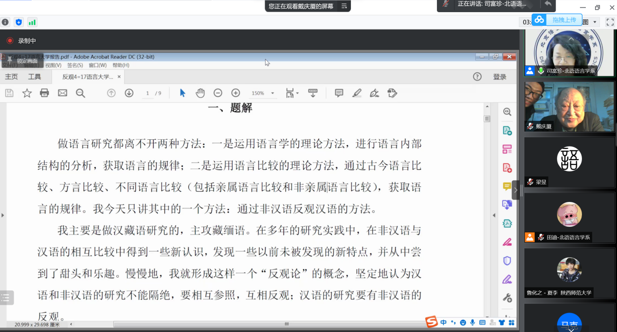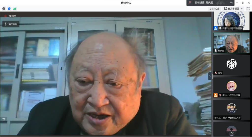 2022年4月15日下午,语言学系理论语言学系列讲座在腾讯会议上进行。应北京语言大学语言学系之邀,著名语言学家戴庆厦教授做了题为“反观论:从非汉语反观汉语”的讲座。戴庆厦教授现任中央民族大学荣誉资深教授,著名语言学家,兼任国家语言文字委员会咨询委员,中国民族语言学会荣誉会长。云南师范大学汉藏语研究院院长,特聘教授。云南大学客座教授、北京语言大学客座教授。主要从事汉藏语系和语言学的教学和研究。本次讲座由北京语言大学语言学系主任司富珍教授主持,吸引了校内外众多师生的关注和参与。
