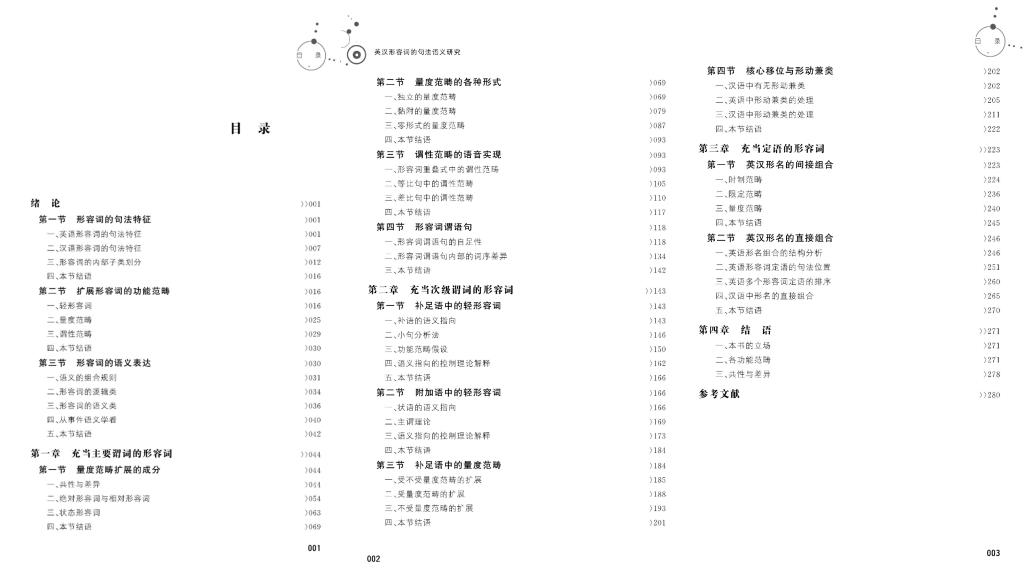 《英汉形容词的句法语义研究》是熊仲儒教授继动词句法与名词句法之后的又一探索,全书以句法位置为纲,分别考察了主要谓词、次级谓词与定语位置上的形容词,涉及的构式有差比句、等比句、形容词重叠、动结式、指宾状语、形名短语与形名复合词等。作者根据生成语法构拟出轻形容词、量度范畴、谓性范畴、量化范畴、比较范畴等跟形容词极为相关的功能范畴,并用这些功能范畴与时制范畴、焦点范畴与达成范畴等揭示出英汉形容词在句法语义上的共性和差异。在诸多功能范畴中,轻形容词、量度范畴与谓性范畴对形容词的研究最为重要。