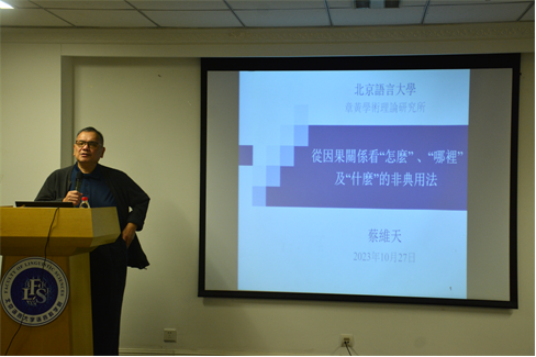 2023年10月27日下午,应章黄学术理论研究所的邀请,台湾清华大学语言研究所蔡维天教授带来了题为“从因果关系看‘怎么’‘哪里’及‘什么’的非典型用法”的学术讲座。本讲延续10月26日蔡教授的“从理必之学看汉语的隐性范畴”讲座,探讨汉语非典型疑问句的结构及其中隐含的隐性范畴,深掘背后的语言学“硬道理”。