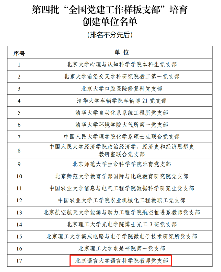 近日,教育部公布了第四批新时代高校党建示范创建和质量创优工作遴选结果,北京语言大学语言科学院教师党支部入选“全国党建工作样板支部”培育创建工作,实现“双创”工作新突破。