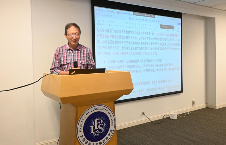 之后,李亚非老师以语言学的“词类原始特征”“句法移位运作”“轻动词”等研究为例,解析其中蕴含的原子论思想。第一,李老师认为动词、名词、介词和形容词等词类范畴在更深的层面都可以被分解为N与V词类特征的组合。李老师也将这种词类范畴的分解与亚里士多德对于世界基本元素的分解进行类比,据此进一步论证汉语不同词类范畴所体现的词类特征正是对原子论使用的公开范例。第二,李老师介绍句法学中的“移位”运作并非最简。从原子论的视角看,移位可分解为组合与复制,即移位=合并+复制。李亚非老师认为这种分解可以解决WH成分在LF层隐性回移带来的一系列问题。第三,李老师认为“轻动词”的本质就是语义分解后按照句法规则进行组合,即自然语言=语义原子+句法规则。比如“王嬙化了那块冰”中的“化”可以分解为“致使+化”。李老师还提出了“理想化语料”,认为“天然语料”有被分解的可能,其中包含相对于某一条句法规则R的核心事实(即筛选语料)和各种干扰因素,即筛选语料=天然语料-干扰因素。李老师认为,这种分解使研究者可以意识到,相对于天然语料,筛选语料对于揭示事物的本质规则更为可靠。