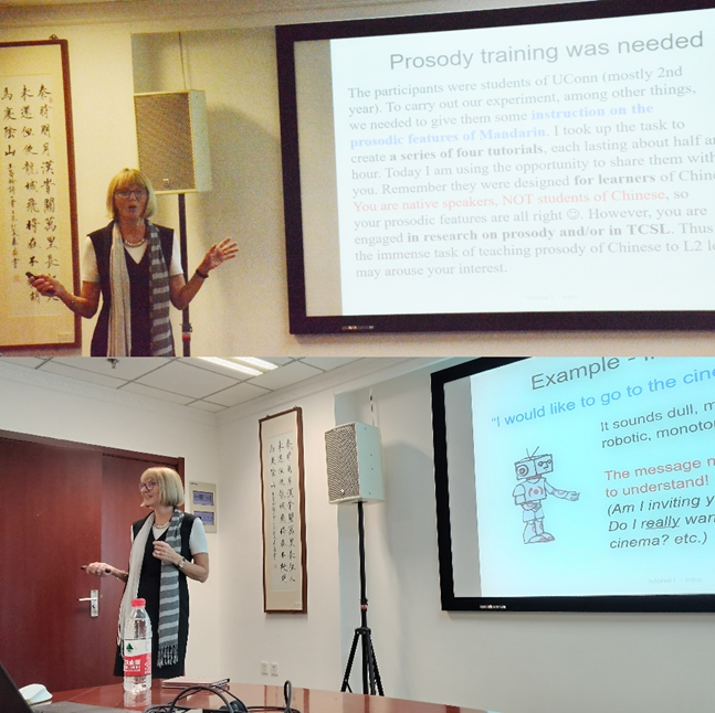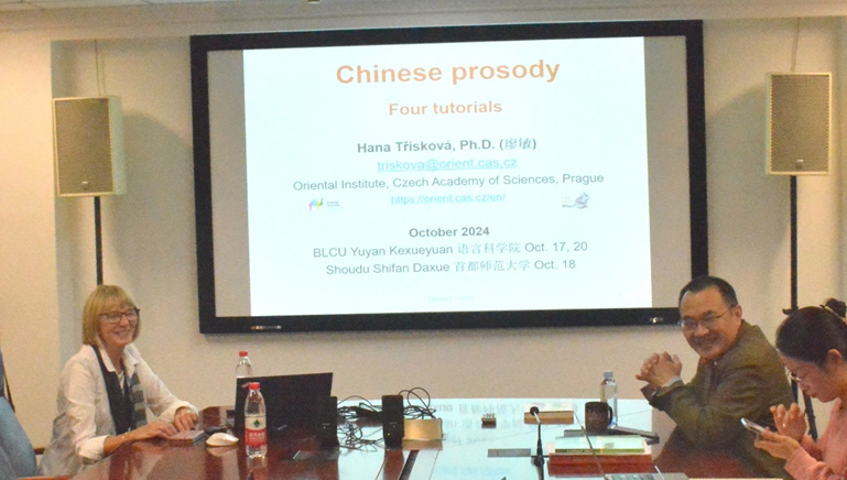 2024年10月17日下午和20日下午,北京语言大学“语言科学大家谈”系列讲座第十八、十九讲在北京语言大学综合楼1223会议室举行。来自捷克科学院东方研究所的Hana Třísková(廖敏)博士作了题为“面向汉语韵律教学的标注系统(CHIPROT)详解(上、下)”的学术讲座。讲座由北京语言大学语言科学院院长曹文研究员主持。