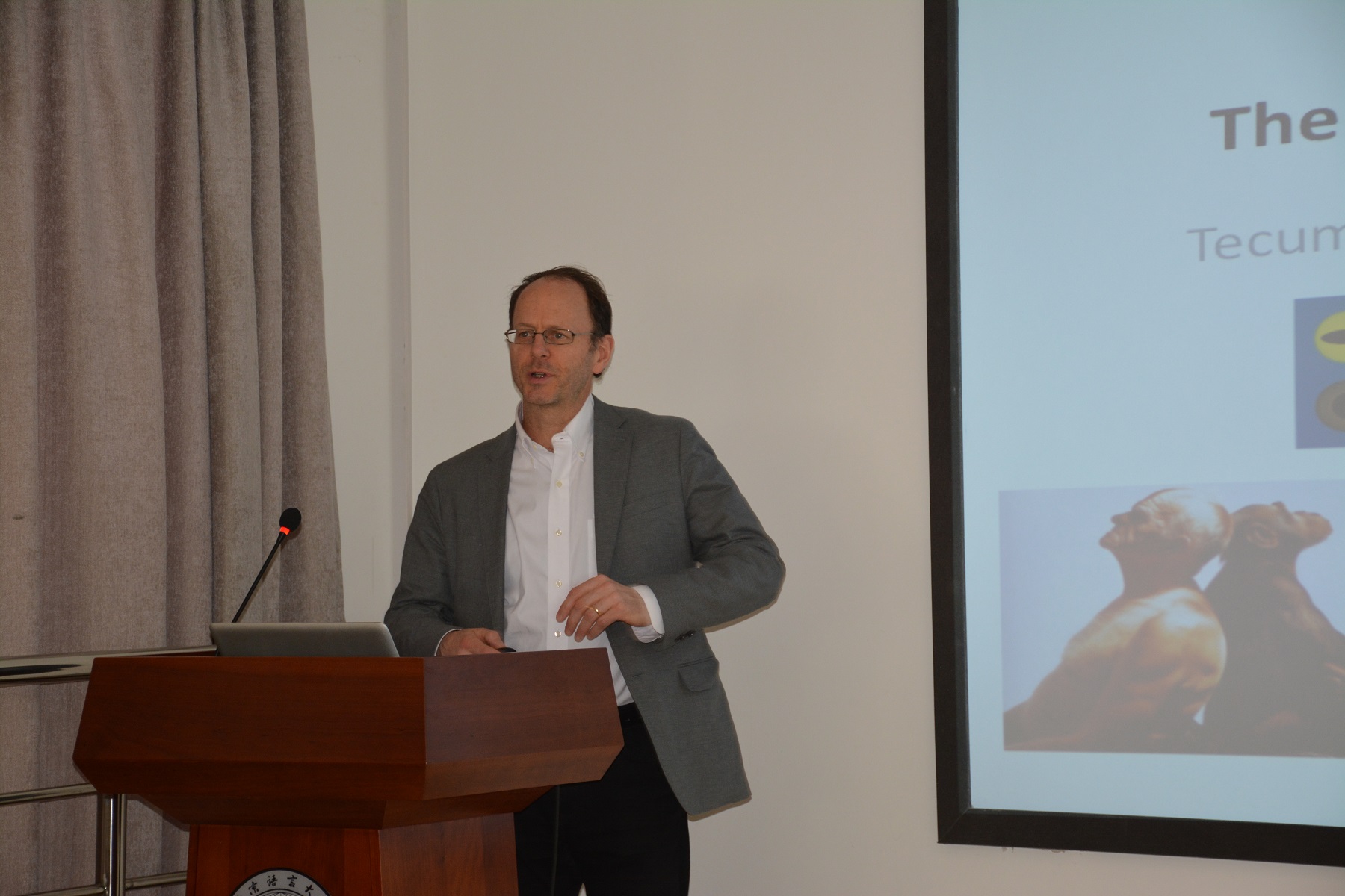 应北京语言大学语言科学院之邀,维也纳大学著名认知生物学系教授威廉·费茨·谢尔曼-三世(William Tecumseh Sherman Fitch III)访问北语,并分别于2015年4月8日和10日做了题为“思维的句法:恋树欲和人类认知”和“论语言的进化”的学术讲座。Ftich教授在讲座中介绍了他本人对语言起源、人类语言与动物交际之间的关系等方面的理论认识和实验结果,内容涉及到生物语言学研究领导多方面的世界性前沿课题,讲座材料中有音频视频演示、有现场实验测试、有图片说明,生动形象、深入浅出,给广大听众留下非常深刻的印象。