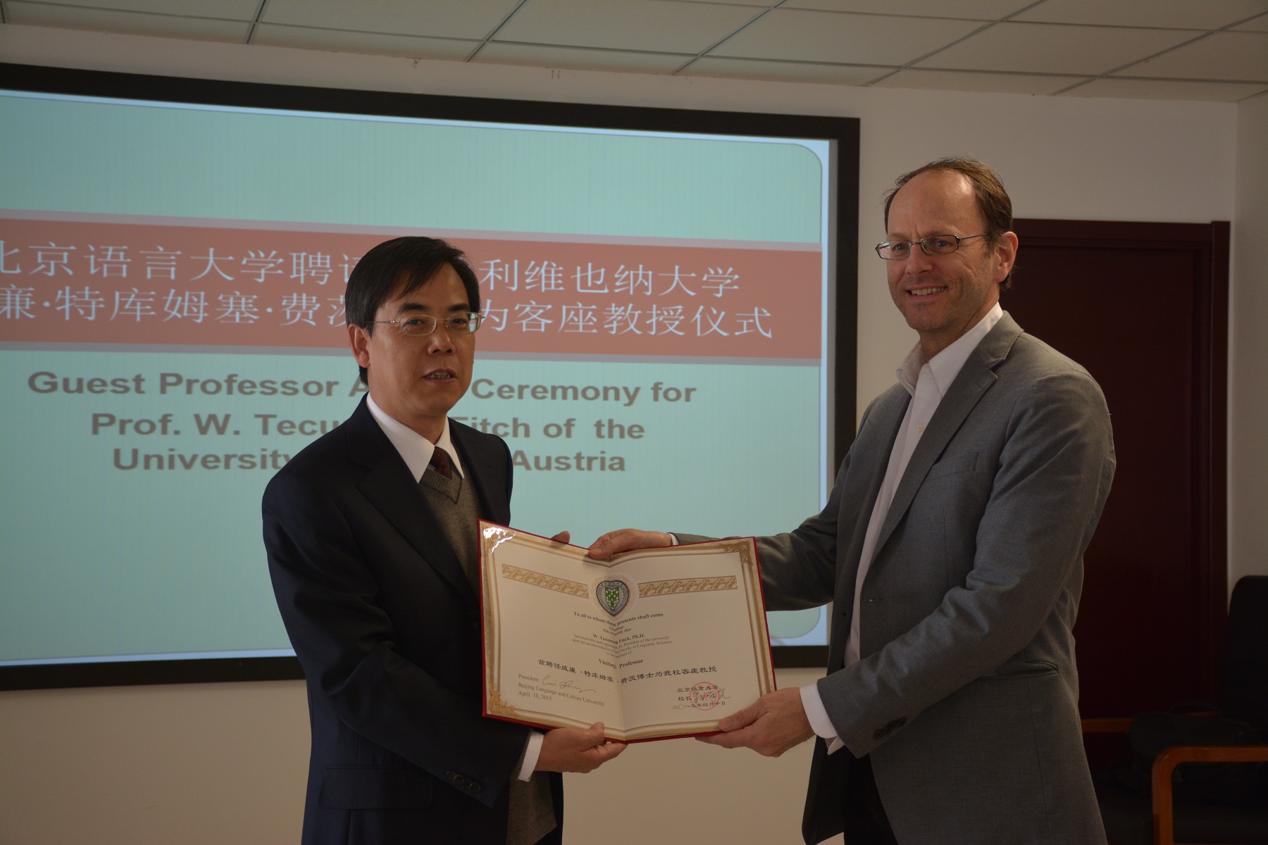 访问期间,北京语言大学还为费茨教授举行了客座教授授予仪式,曹志耘副校长为费茨教授颁发了证书,北京语言大学国际合作与交流处张宝钧处长、语言科学院战立侃博士、外国语学部刘林军教授、以及北京外国语大学黄晓亮博士、北京农业大学衣莉博士等专业学者参加了仪式并听取了讲座。