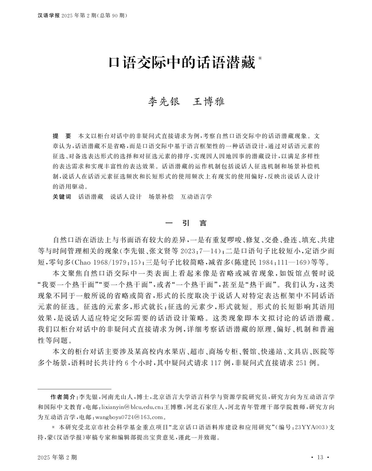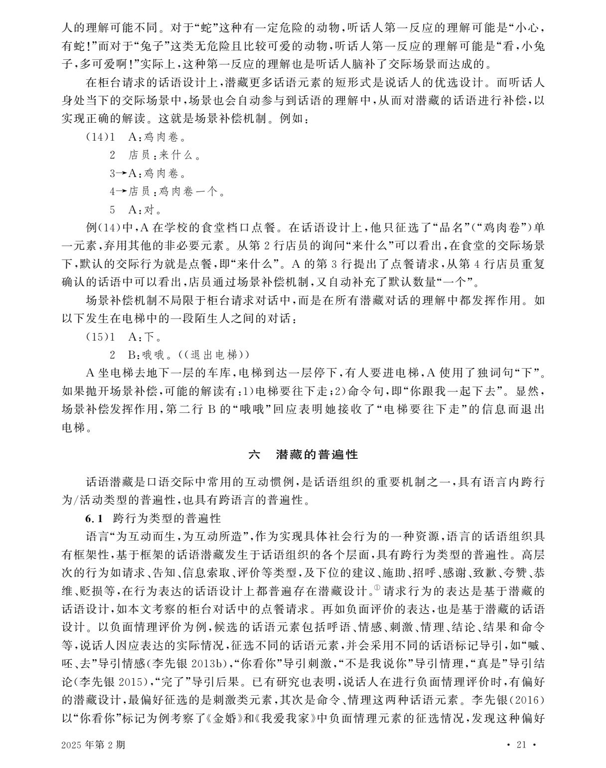 本文来源:李先银 王博雅《口语交际中的话语潜藏》,《汉语学报》2025年第2期(总第90期),P13-24。