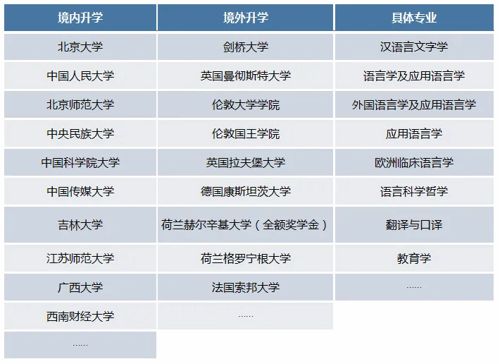 在学生国际交流方面,语言学专业共有 2 名学生前往曼彻斯特大学、1 名学生前往澳洲麦考瑞大学交换学习,同时接收 1 名来华留学生跟班学习。毕业生升学成绩优异,多人获得伦敦大学学院、英国曼彻斯特大学、拉夫堡大学、德国康斯坦茨大学、香港中文大学等世界顶尖学府的录取通知,涉及语言学、教育学、媒体与传播学等多个专业。