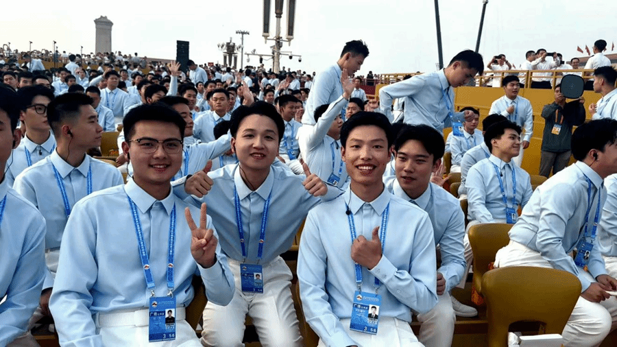 2025年9月3日上午9时,纪念中国人民抗日战争暨世界反法西斯战争胜利80周年大会在北京天安门广场隆重举行。我院共9名师生加入到纪念活动北语服务保障团队。其中,辅导员孟雪老师担任志愿者服务保障团队带队教师,8位同学分别作为志愿者及合唱团成员参加活动。他们共同亲历了几个月的刻苦训练和阅兵现场的全过程,也共同见证了这场缅怀历史与倡导和平的盛大纪念活动。