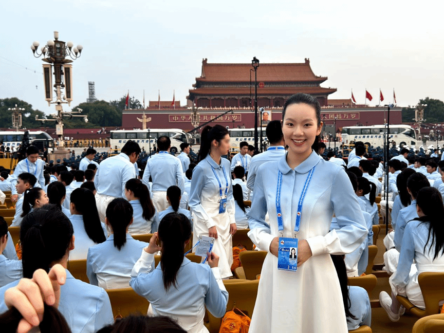 大家好!我是阅兵式广场合唱团中的一员。其实在最开始辅导员老师打来电话,询问我相关意愿的时候,我对于即将要参与一场什么样的活动是完全茫然的,而是在训练不断推进的过程中,我才愈发感觉到自身责任的重大。这一路上有过一些自身工作实习与训练安排冲突,需要割舍前者的抉择;也有过外出训练到凌晨,回到寝室倒头就睡的疲惫;还有过因为训练频繁,无法离校时对家人的思念。但是当我真正站在广场上,唱出属于我们的声音的时候,我觉得一切都是值得的,看着五星红旗缓缓上升,人民军队从我们眼前威武行进,以及和平鸽从身后蜂拥而出,我的眼泪再也止不住,我觉得这一路上最重要的不仅仅是最后的光荣,更是对我们爱国心、责任心和顽强意志的淬炼。反法八十,广场有我!愿祖国繁荣富强,愿人民幸福安康!